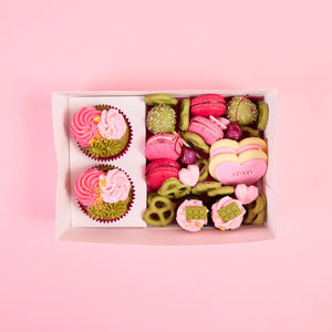 At the heart of the box are our signature matcha cupcakes, beautifully piped with both strawberry and matcha buttercream for the perfect balance of sweet and earthy. Finished with glittered maraschino cherries and packed with a curated mix of matcha and pink treats, this box is made for girls’ nights in, bestie dates, and Galentine’s celebrations.